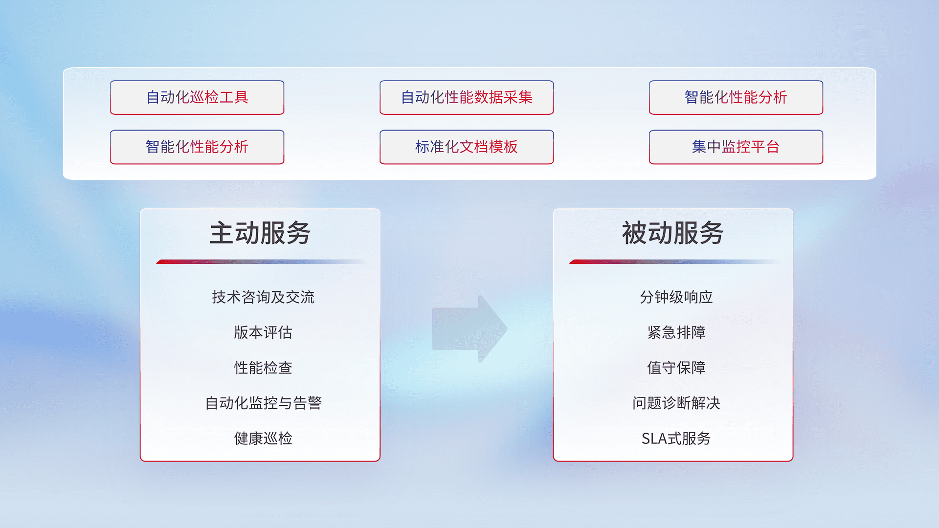智能化工具和标准化文档,,,,保障服务质量,,,提供主动服务(包含技术咨询、、版本评估、、、性能检查、、自动化监控与告警、、、、健康巡检)和被动服务包含(分钟级响应、、、、紧急排障、、、、值守保障、、、、问题诊断解决、、、SLA服务)。。
