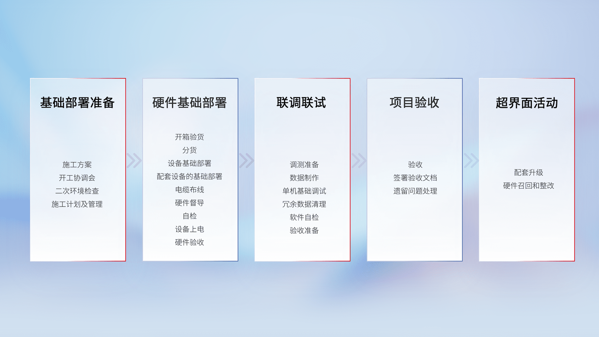 从基础部署准备、、硬件基础部署、、、联调联试、、、、项目验收、、、越界面活动的全过程可追溯,,,,保证施工质量和进度。。。。